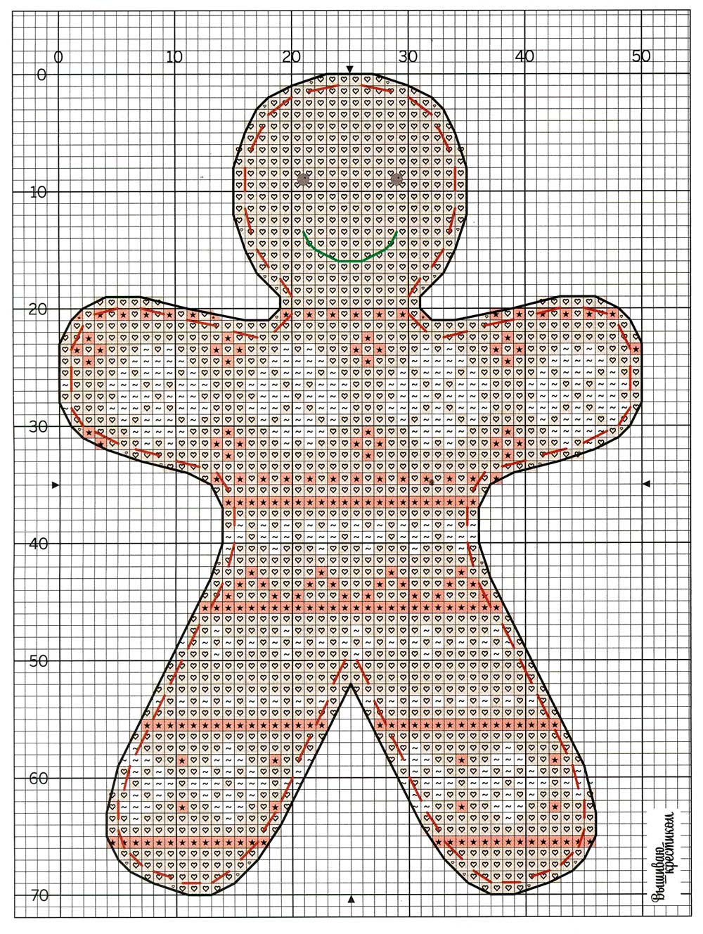 Стібками «вперед голку» вишиваються святкові сніжинки і контурна лінія тулуба пряникового чоловічка.