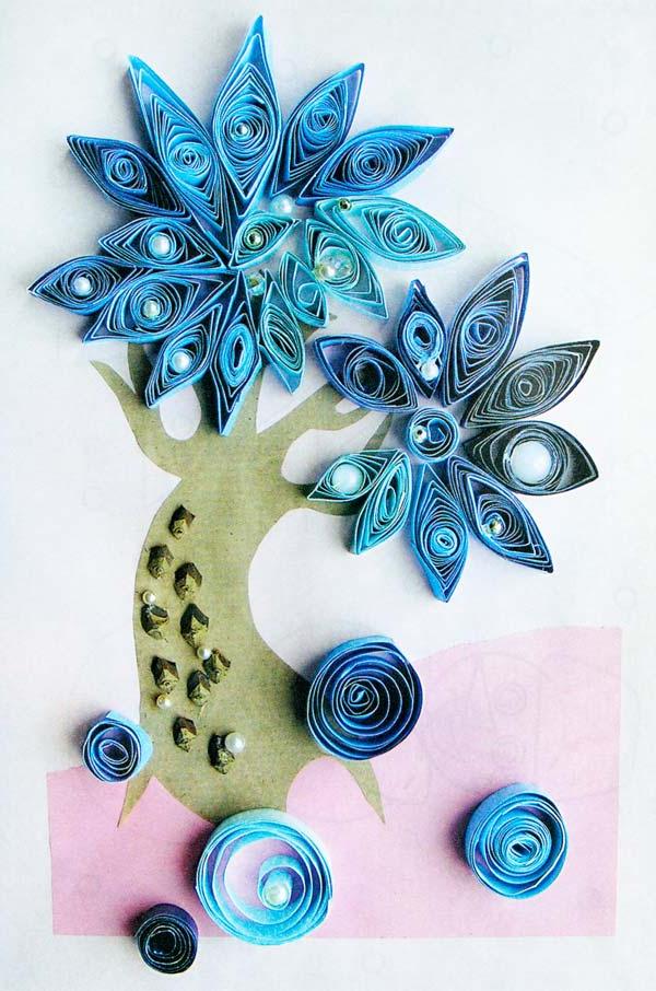 2. Крона дерева формується із згорнутого пухкими моточками серпантину. Кінці моточків закріпіть клеєм, щоб вони не разматывались, і приклейте на відповідне місце.