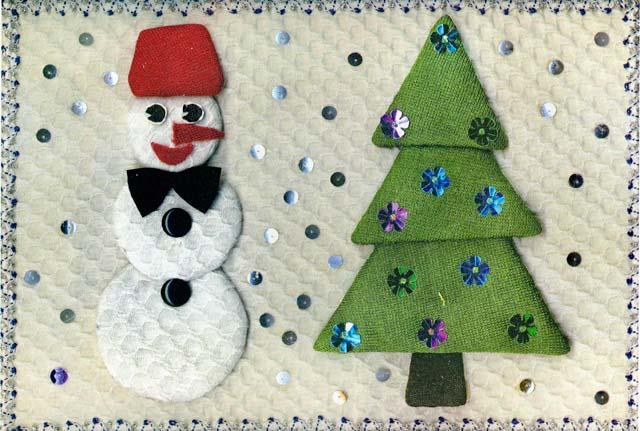 3. Коли клей підсохне, можна додати дрібні деталі. Рот, ніс та очі сніговика можуть бути з тканини, паперу або гудзиків. Для прикраси фону і ялинки використовуються блискітки і квіточки з фольги (якщо є бісер, то квітку можна пришити до основи, використовуючи бісеринки).
