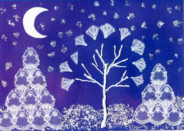 2. Виріжте шматочки мережива потрібної форми: частина з них приклейте навколо гілок, імітуючи сніг, а іншу частину використовуйте для зображення ялинок.