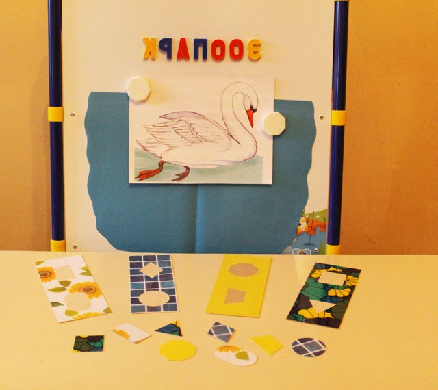- Діти, а в мене є рушники, тільки вони трохи порвалися. Ось заплаточки різних кольорів і форми. Давайте полагодимо рушники для лебедяти, підберемо заплатки такої ж форми і кольору, як і дірочки.