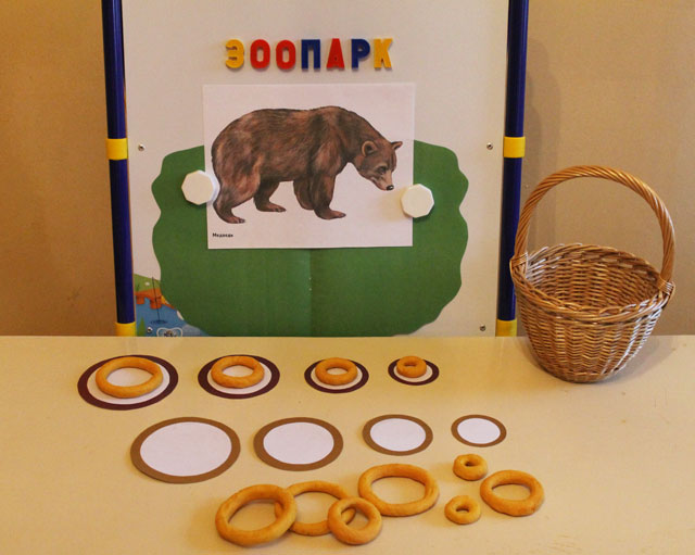 - Діти, а у мене в корзинці є бублики, вони різного розміру, є і великі, і маленькі, давайте пригостимо ними ведмедя, думаю, він буде дуже радий. Тільки спочатку розкладемо їх по тарілочках: на велику тарілку покладемо велику баранку, на тарілочку поменше - бублик поменше, на маленьку тарілочку - маленьку баранку, на саму маленьку тарілочку - найменшу бараночку.