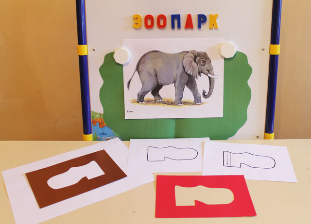 - Діти, давайте намалюємо для слона туфельки, використовуючи трафарет. А потім зробимо туфельки смугастими, провівши на них лінії зверху вниз (показую). Діти виконують завдання «Туфельки для слона».