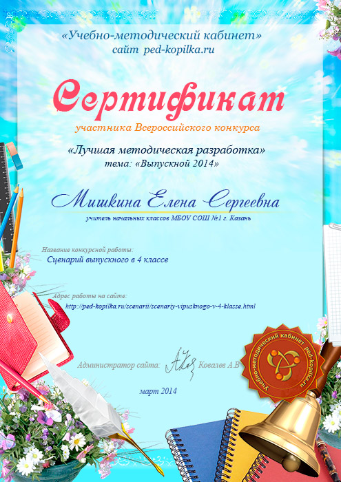 Учасник №2 Розробка позакласного заходу на випускний у 4 класі «Прощавай, четвертий клас!» Автор: Санькова Тетяна Валеріївна, вчитель математики, р. Хакасія, р-він Аскизский, с. Бирикчуль |