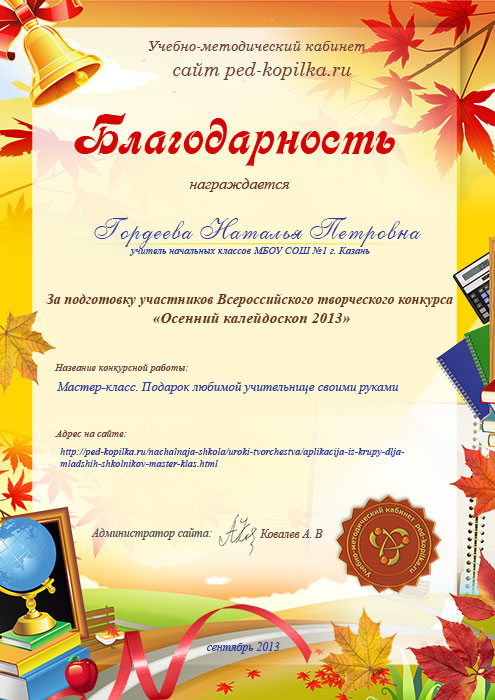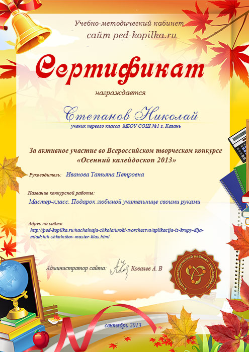 Тільки після розміщення роботи на сайті ви відправляєте заявку на отримання Сертифіката та Подяки (в темі листа пишіть «Подяка за участь в осінньому конкурсі»)