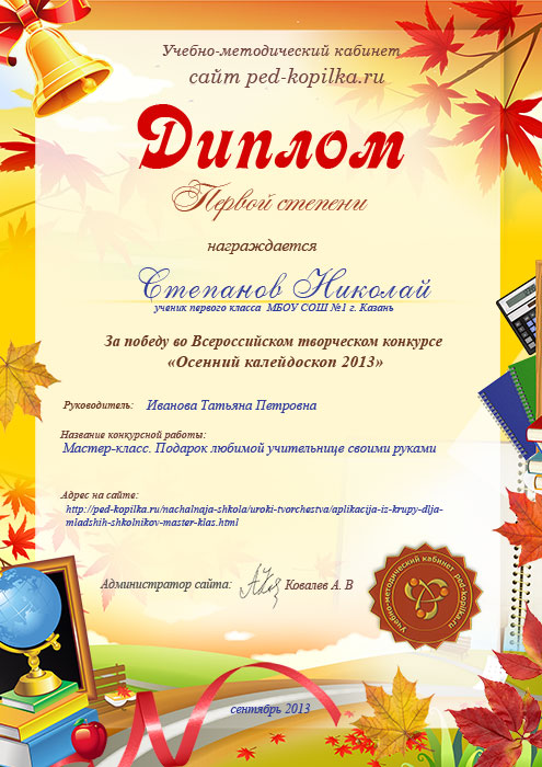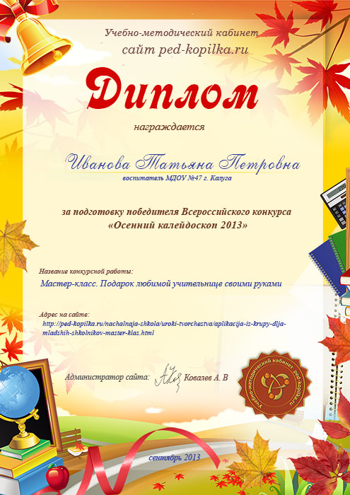 Учасник №33 Майстер-клас. Аплікація "Кленовий лист" Автор: Кузьміна Міла Володимирівна, заст. директора з виховної роботи |