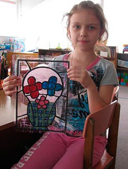 Учасник №82 "Квіти у кошику" в техніці вітраж Автори: Марія Єркову Вік: 9 років Педагог: Саакян Олена Миколаївна