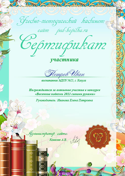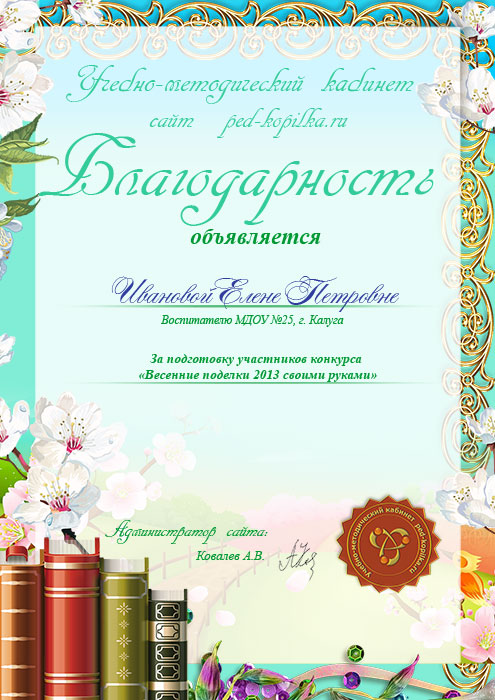 Як тільки ваша робота Учасника конкурсу «Весняні вироби своїми руками» буде розміщена на сайті, то Ви можете написати заявку на отримання Подяки та Сертифіката за участь у конкурсі.