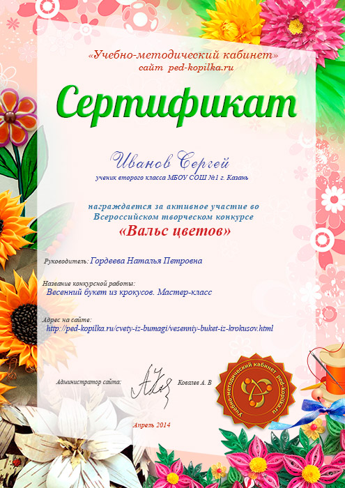 Учасник №52 Майстер - клас «Квітковий букетик» Автор: Крес Наталія Яківна, вихователь МКДОУ «Большеплотавский дитячий садок», село Великі Плоти, Єфремівський район, Тульська область |