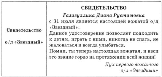 Сьогодні такий особливий день, такий день, що я навіть готовий пробачити вам всі ваші запізнення на планерки. Ви всі працюєте в таборі перший раз, а це значить, що вам належить пройти церемонію посвячення в вожаті. І рівно (дивиться на годинник) через 1 годину і 48 хвилин ви станете вожатими про/л «Зоряний». Для цього вам належить пройти ряд невеликих випробувань і довести всім, а головне собі, що ви гідні високого звання вожатий про/л «Зоряний». Запрошую першого бажає!