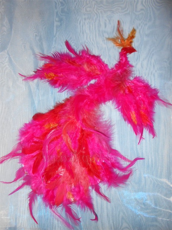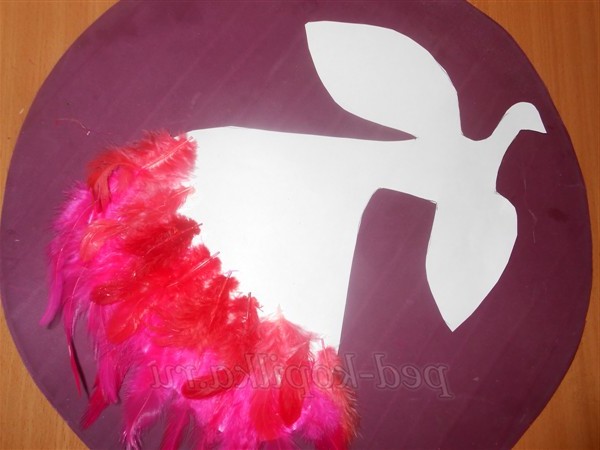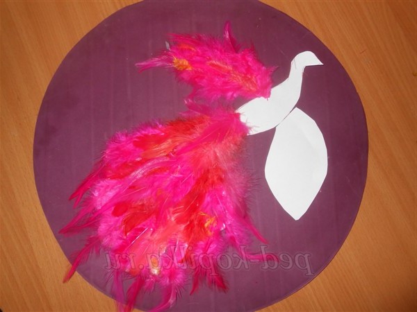 7. Наклеїти пір'я у напрямку знизу вгору на тулуб і голову. Прикрасити голову птиці чубчиком.
