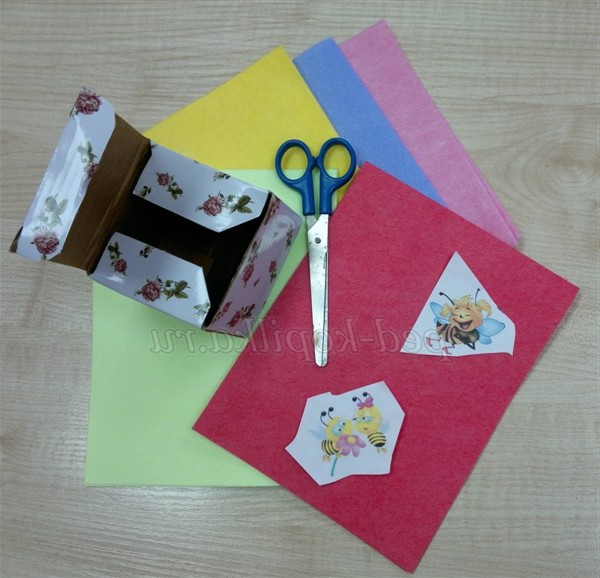 7) Декоруємо коробку кольоровими картинками у вигляді бджілок.