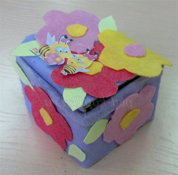 Матеріали та інструменти: коробка, фетр, ножиці, клей, кольорові картинки.