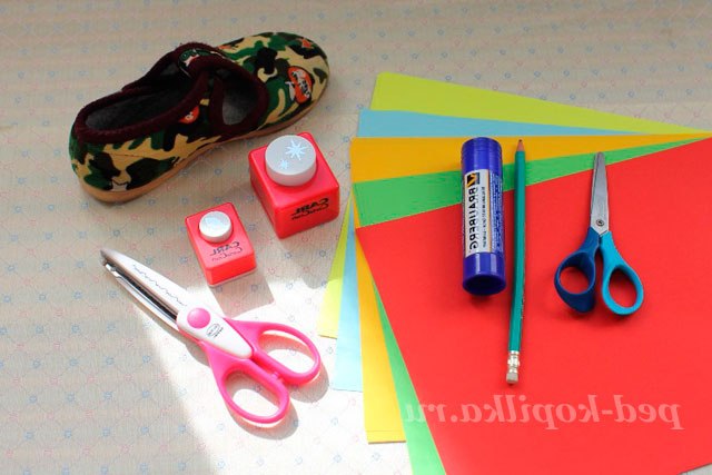 Тонований папір (2-5 кольорів), картон або щільний папір, клей ПВА, або клей-олівець, простий олівець, ножиці, фігурний дирокол, тапочок