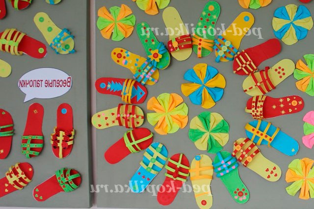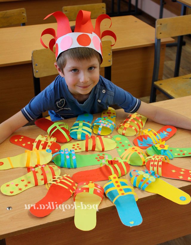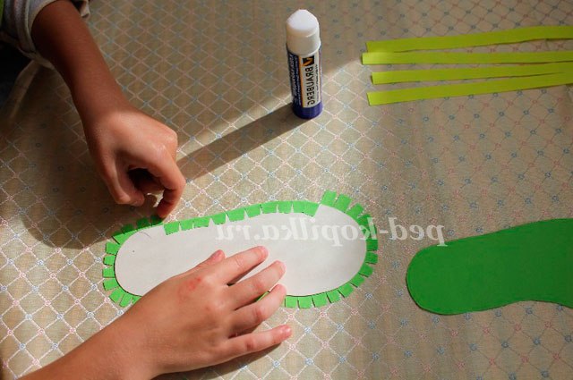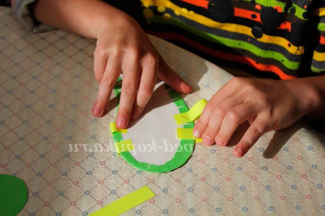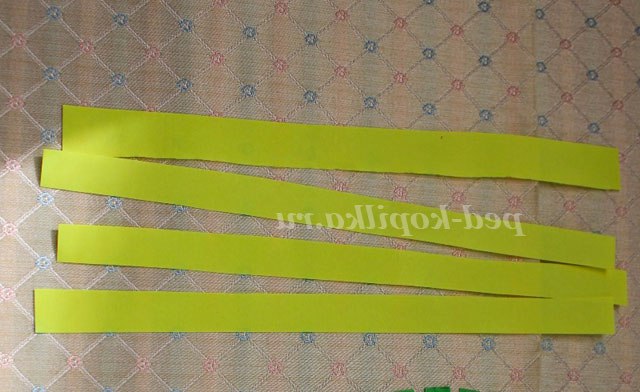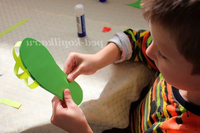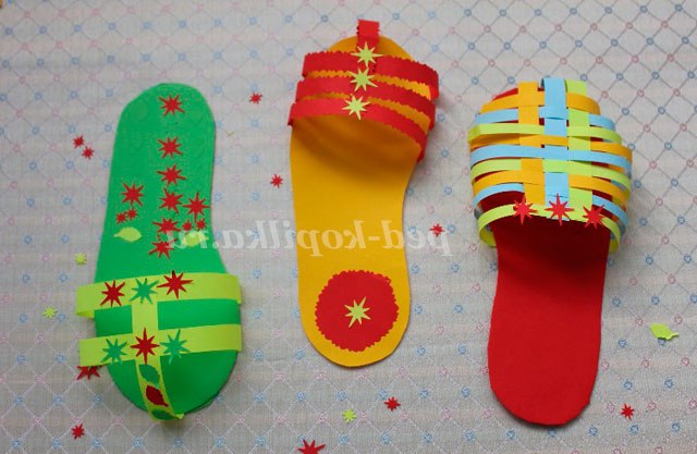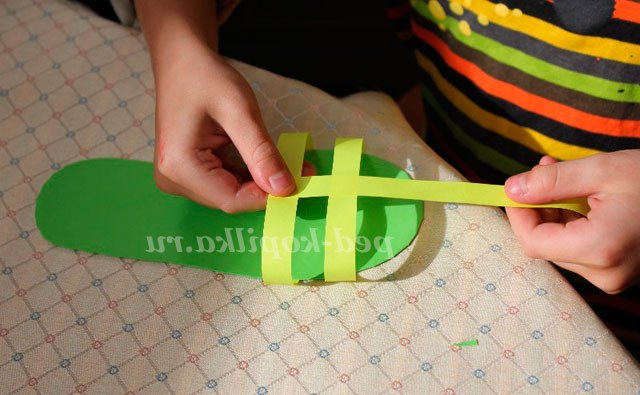 7. Поки нашого краю тапочка сохнуть необхідно вирізати кілька різнокольорових смужок кольорового паперу товщиною