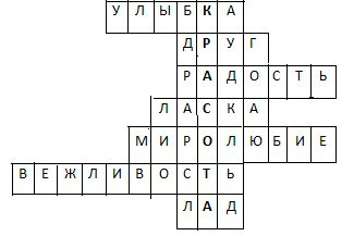 Але щоб дізнатися, як вона називається, розгадаємо кросворд. Для цього я вам видам листочки з добрими словами. Вам потрібно підрахувати кількість букв у кожному слові і знайти для цього місце слова в кросворді. По виділеній вертикальній лінії ми прочитаємо слово.