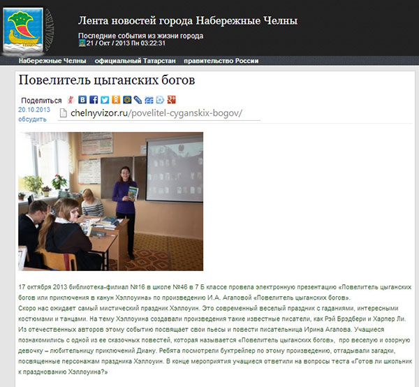 Примітка: Книгу В. Агапова «Цей Хеллоуїн!» керівники бібліотеки № 16 отримали як приз на «Давыдовском» фестивалі. На стор 173 цієї книги і опублікована повість «Володар циганських богів», яка знайшла прекрасне застосування на практиці! А сам захід по повісті було висвітлено центральним сайтом новин р. Набережні Челни від 21 жовтня 2013 року. Вітаємо письменника і читачів з гармонійним літературним консенсусом.