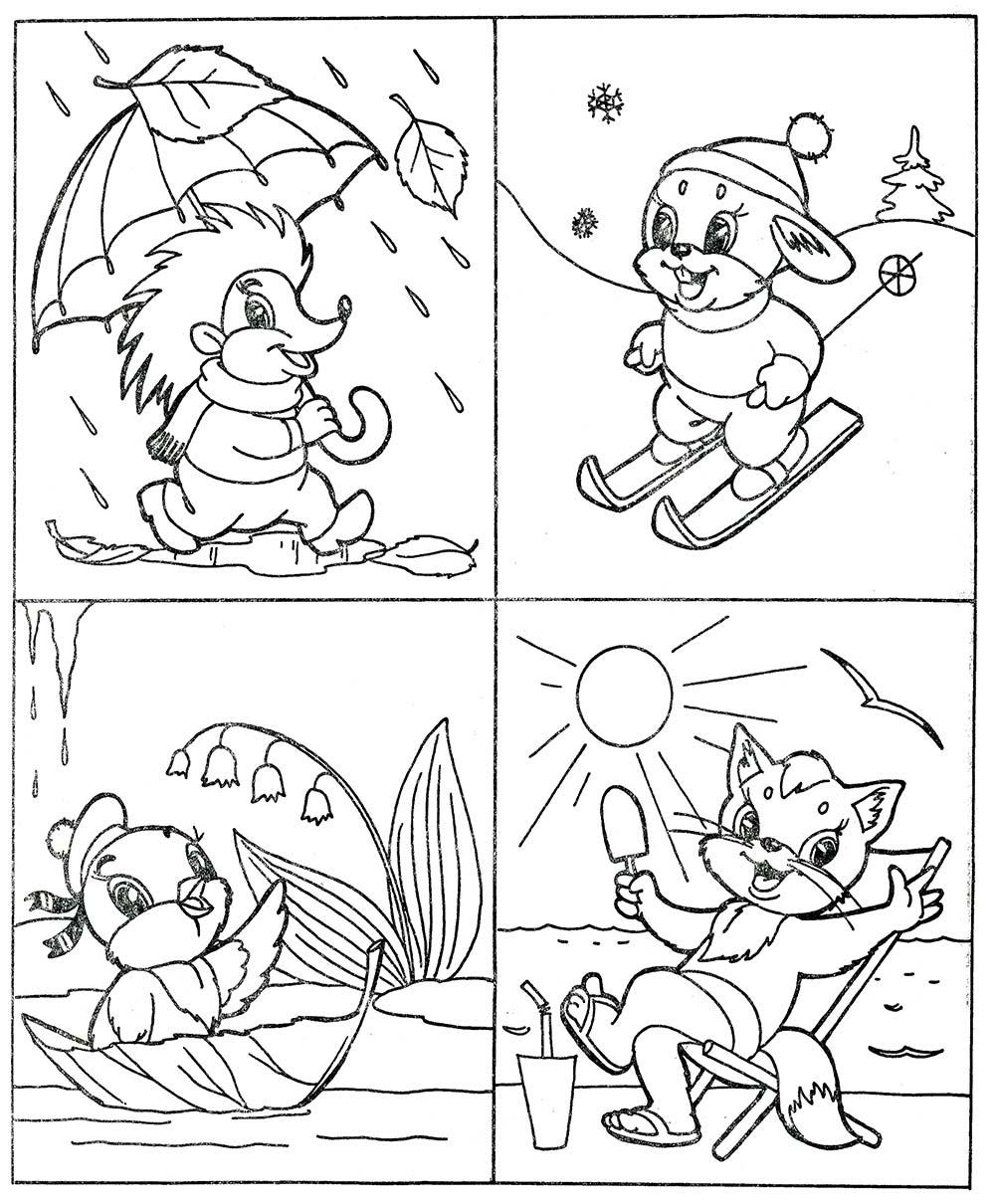 Розмовляю з дітьми з допомогою запропонованих нами картинок, ви проаналізуєте кожну пору року і його особливості. Крім того, потім ці картинки можна розфарбувати і влаштувати виставку малюнків.