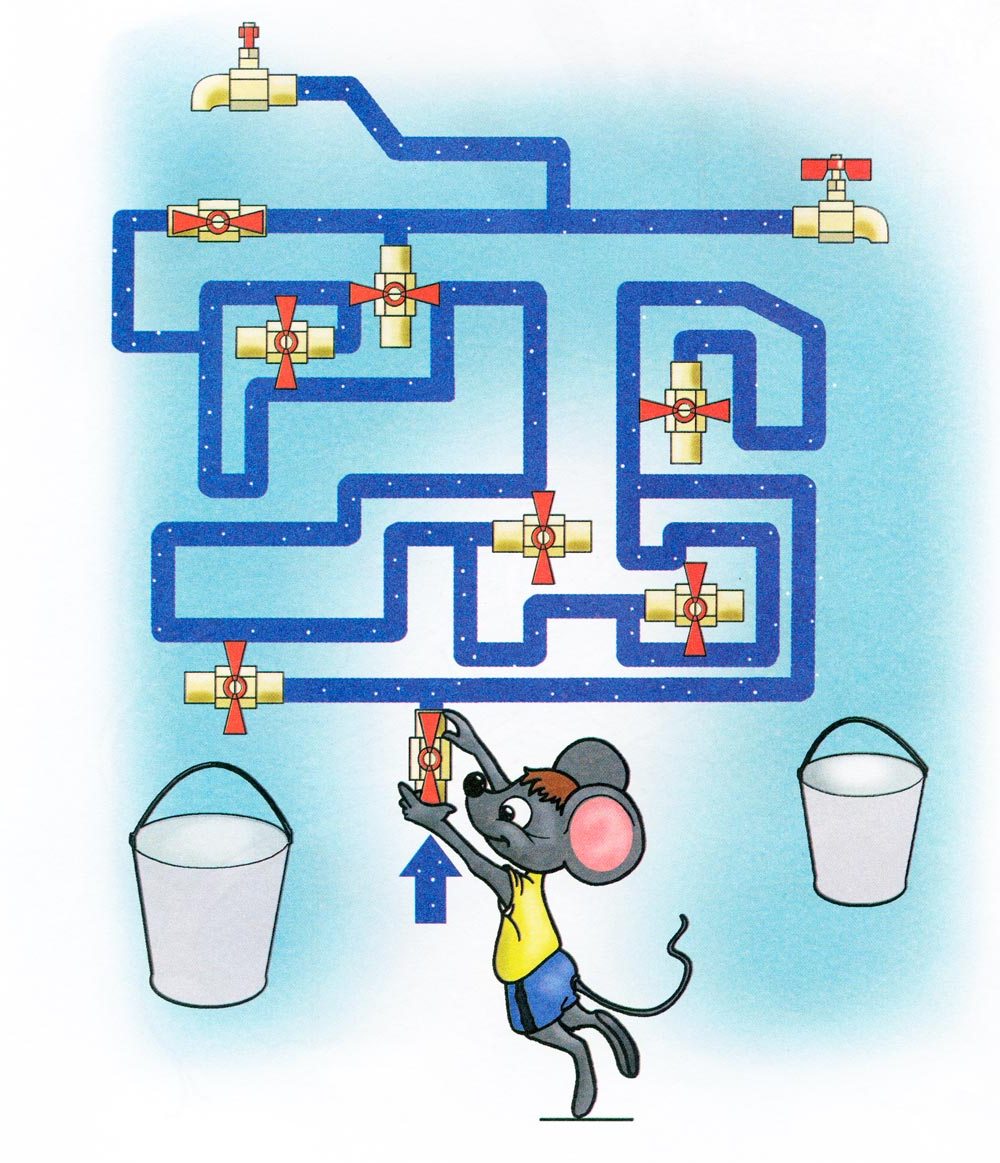 Мишеня відкрив кран і вода потекла в шланги. Які крани відкриті, а які закриті - Мишеня не знає! Допоможи Мишеняті, перевір всі шланги і крани. Звідки поллється вода? Знайди цей кран, намалюй струмінь води, підстав під кран відро і розфарбуй.