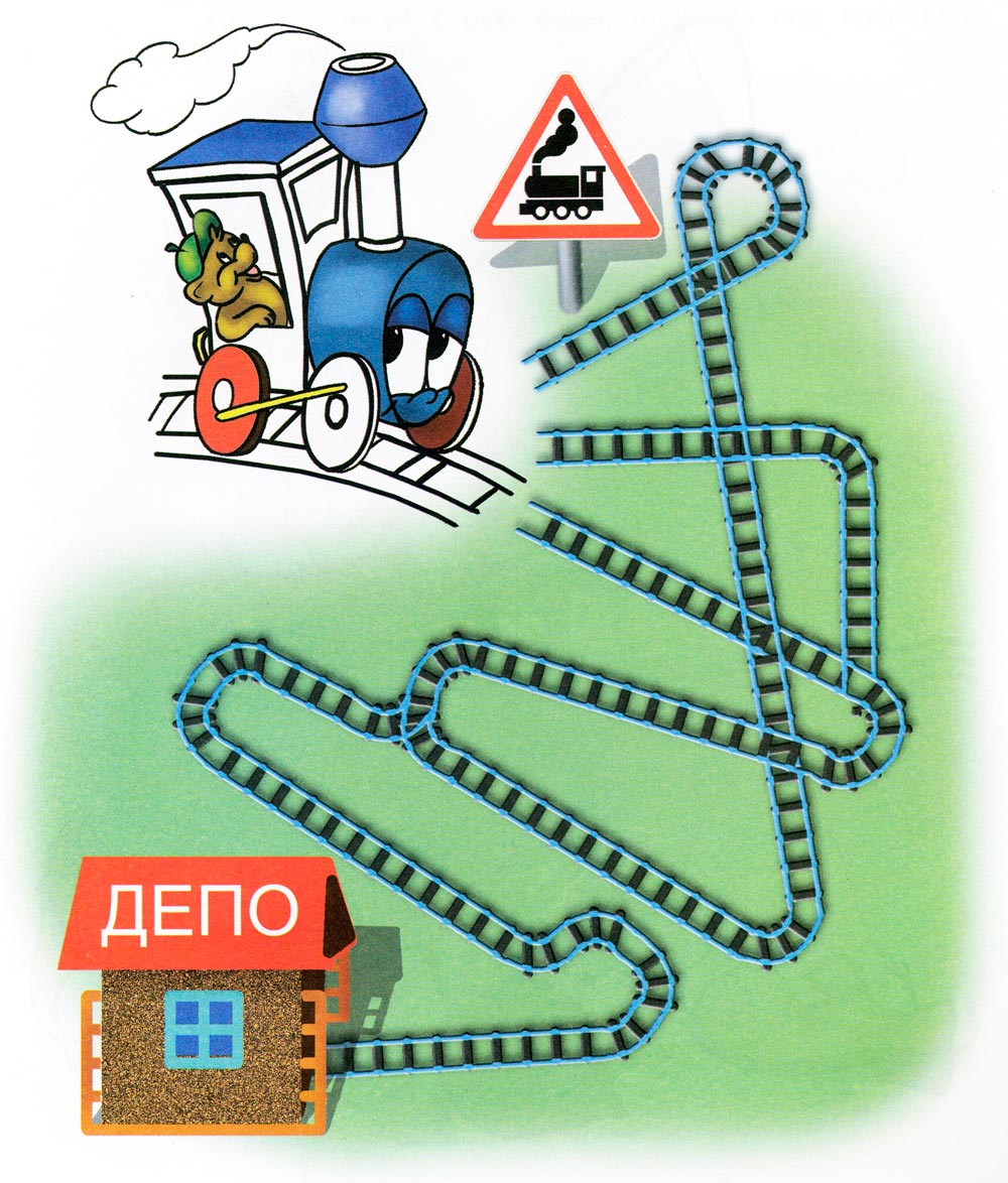 Машиніст веде свій паровозик в депо. Покажи машиністові яким шляхом йому треба їхати. Розфарбуй паровозик.