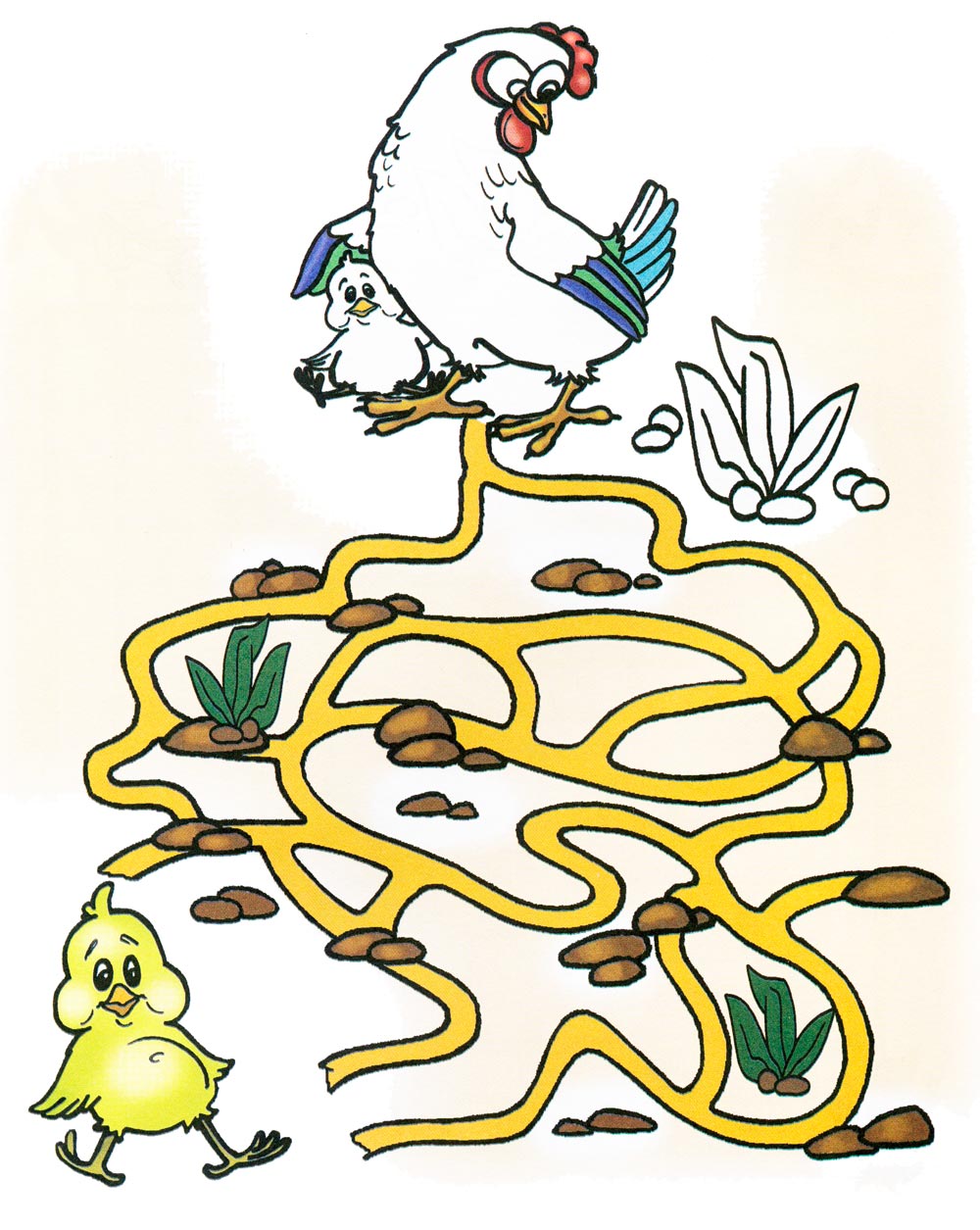 За якою доріжці повинен бігти Курча, щоб потрапити до своєї Мами? Допоможи йому знайти правильний шлях. Розфарбуй картинку.