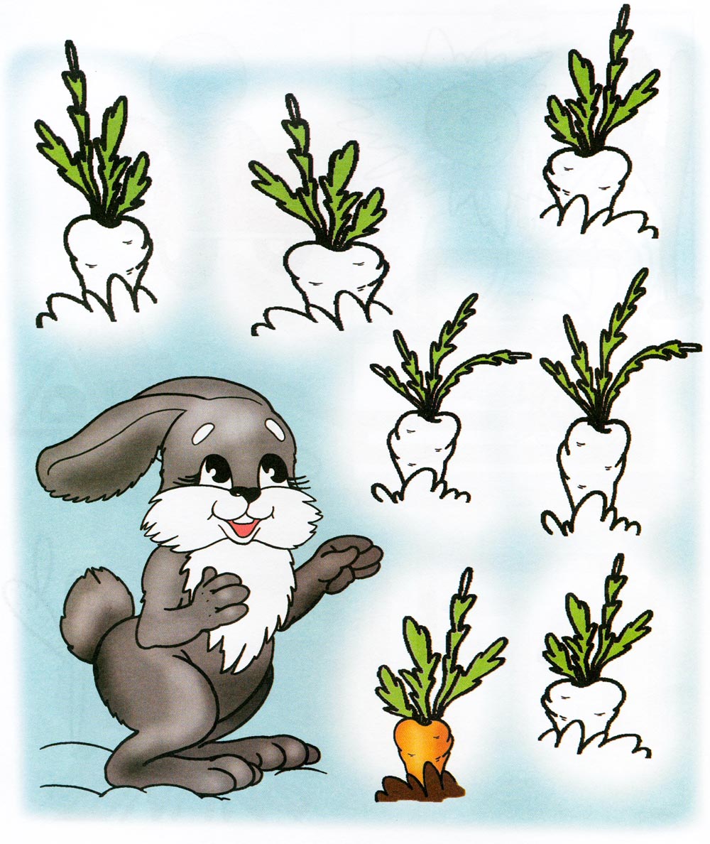 Допоможи Кролику зібрати всі морквини. Намалюй найкоротший шлях, по якому Кролик знайде кожну моркву. Розфарбуй всі знайдені Кроликом морквини. Скільки морквин зібрав Кролик?