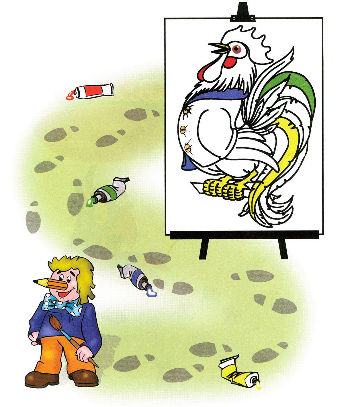 Художник не закінчив портрет Півника. Пройди по слідах Художника, збери фарби, які він втратив і розфарбуй Півника.
