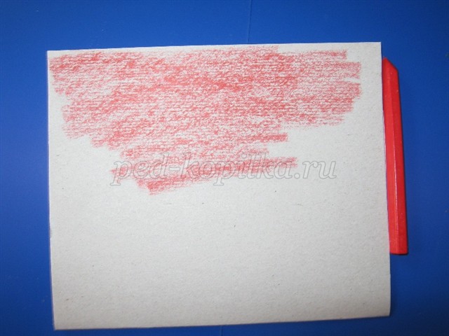 Лист щільного паперу або картону повністю зафарбовуємо восковими крейдою. Колірне рішення залежить від задуманого малюнка. (Можна зафарбувати лист аквареллю різних кольорів, але тоді зверху малюнок вкривається звичайної воскової свічок. Так само можливе використання простої білого або кольорового паперу, зафарбованої свічкою).