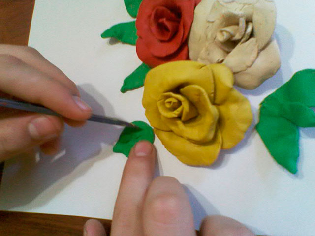 Деякі деталі пластилінової картини можуть мати складний контур. В такому випадку треба накласти пластилінову коржик і видалити надлишок пластиліну за допомогою стека.