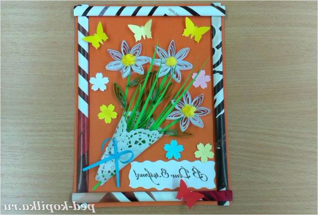 Квіти виконані в техніці "дитячого" (спрощеного варіанту) квілінгу. Рамка картини зроблена з скручених в трубочки аркушів паперу з журналу.