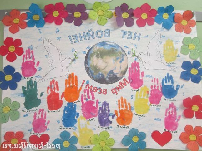 Плакат присвячений Дню Перемоги! Виконаний з елементами аплікації:квіти, мирні голуби, земна куля, і малювання долоньками дітьми. Ми говоримо:"Ні-війні - Мир всім!"