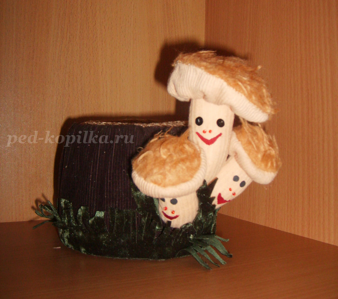 Ось ці симпатичні і смішні грибочки на пеньочку служать оформлення скарбнички.
