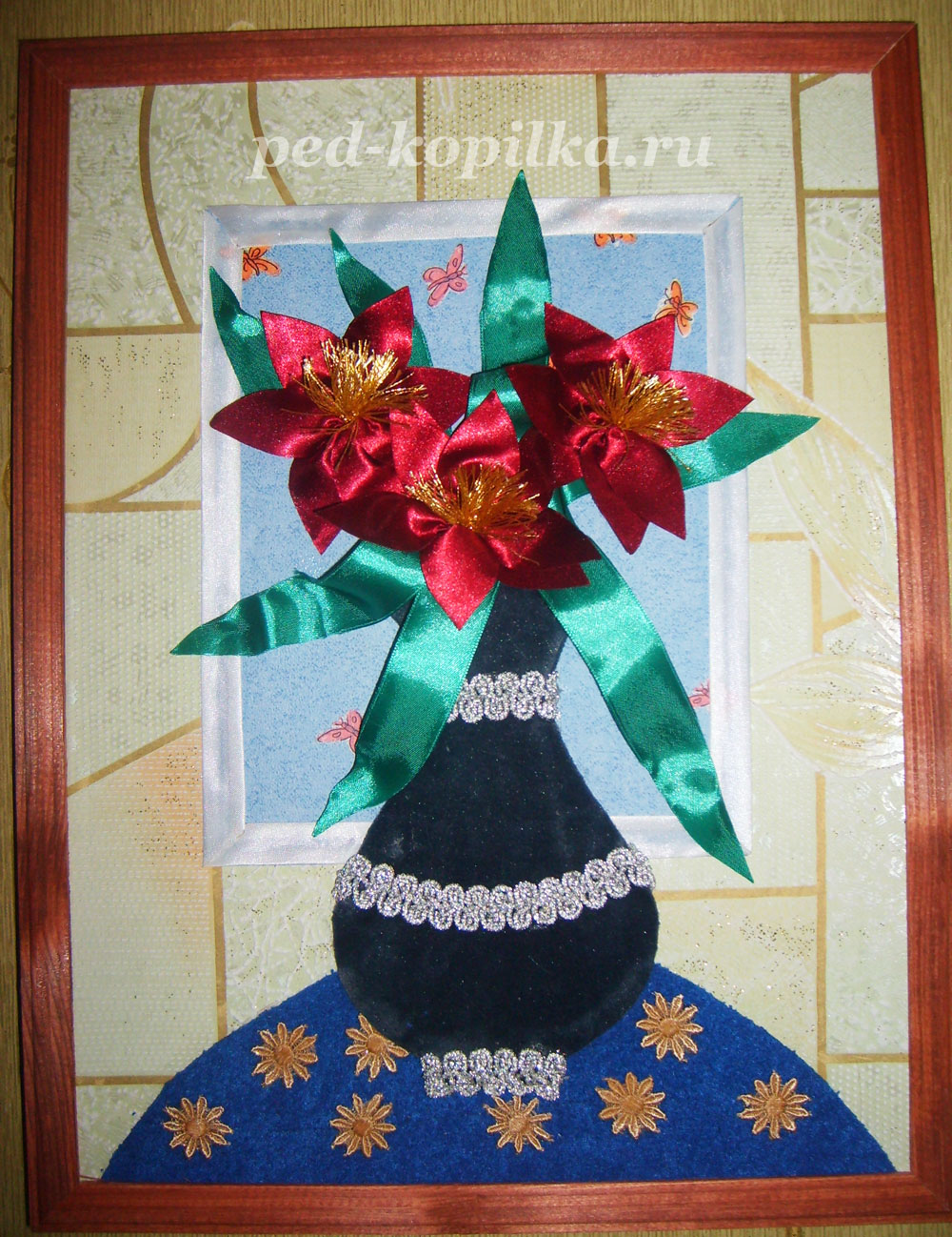Аплікація виконана з атласних стрічок, картону і тасьми