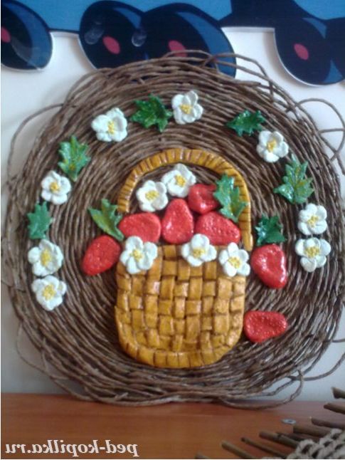 В цій роботі також використано плетіння з паперового поштового шпагату. Таким же шпагатом декоровані і прикрашені паєтками "банки" вази на фотографії майстер-клас "Зимова казка"