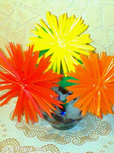 Квіти виготовлені з кольорових коктейльних трубочок. Скріплюються пелюстки між собою за допомогою степлера.