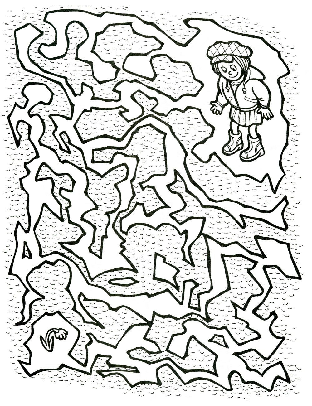 Допоможи дівчинці добратися до підсніжника, минаючи калюжі і струмочки. Розфарбуй картинку