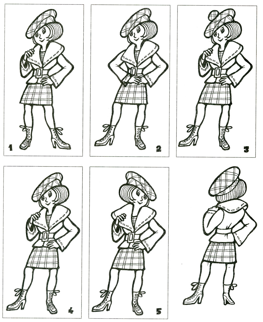 Серед відображень дівчинки в дзеркалі знайди одне правильне. Розфарбуй його.
