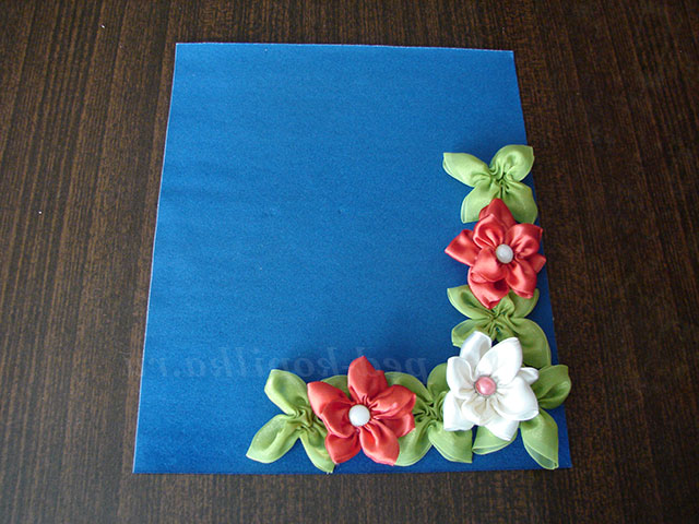 Листівка оформлена квітами з атласних стрічок