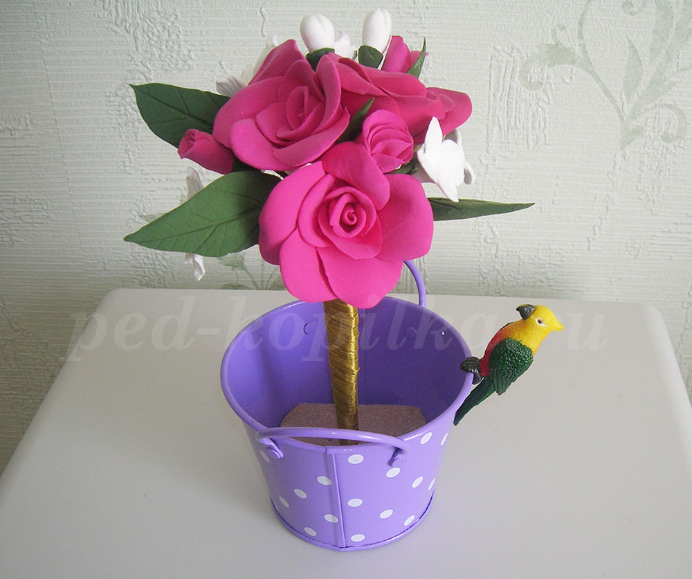 Це квіткове дерево зібрано з троянд, зроблених з полімерної глини