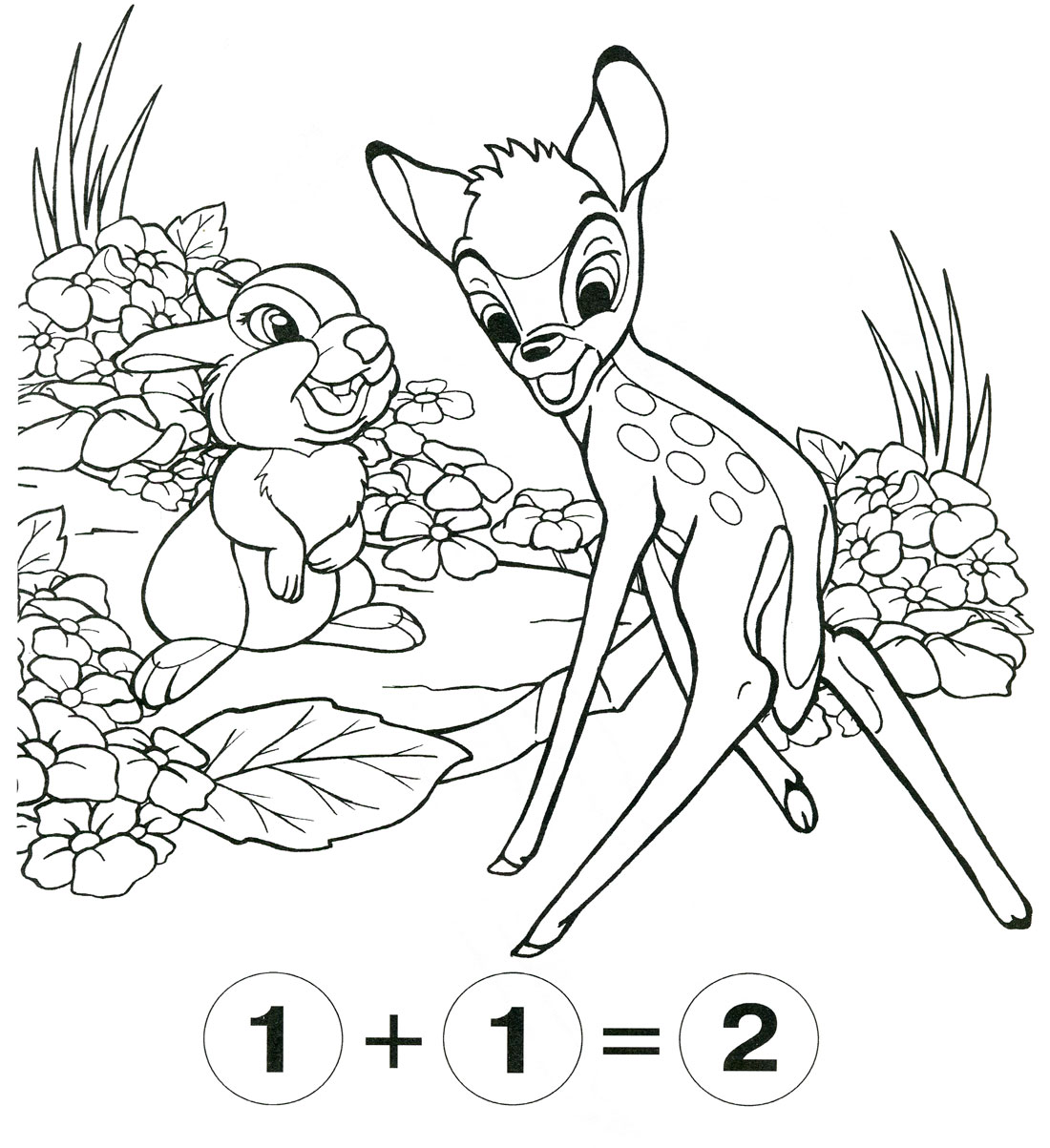 Спочатку я поясню тобі, що таке додавання. Це коли до одного числа додають інше число. Результат математичної дії називається сумою. Наприклад, тут намальовані Бембі і Топотун. 1+1=2. Всього 2 звірка.