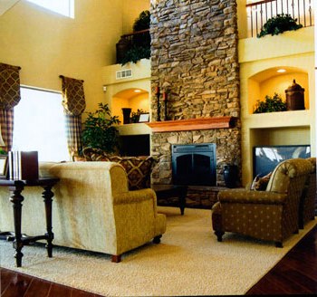 Інтер'єр в стилі середньовічного замку: камін, кам'яна кладка, стилізовані штори... Все це створює атмосферу романтики, властивої Середньовіччю. Але на відміну від старовинних замків кімната не виглядає похмурою. Тут багато світла, затишно і дуже комфортно. Світлі стіни зберігають свіжість і простір. Килим вдало виділяє камінну зону. Він додає кімнаті м'якість і гармонію.
