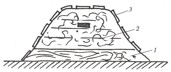 Малюнок 1. Купа для димлення: 1 - сухої горючий матеріал (стружки); 2 - листової сміття, бадилля, торф; 3 - земля