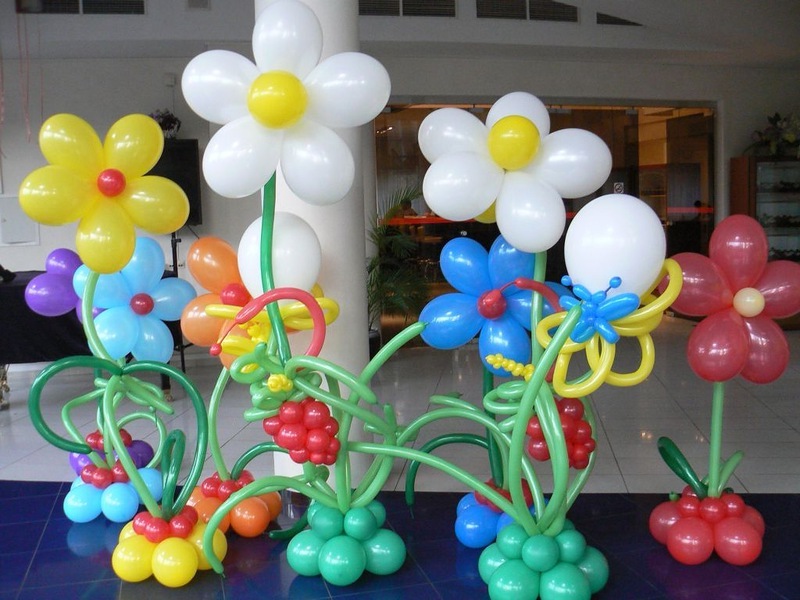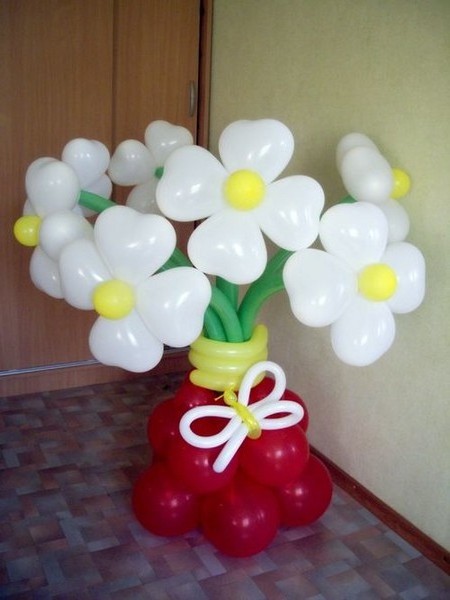Для створення цієї композиції потрібно 5 куль. Чотири з них повинні бути одного кольору, один - іншого. Всі кулі надуваються, закріплюються нитками і зв'язуються парами. 4 кулі одного кольору зв'язуються між собою - це пелюстки, куля іншого кольору поміщається в центр. Таким же чином робляться інші квіти. Їх можна прикріпити на штори, наличник двері або меблі. Зробити це можна скотчем. Квіти з кульок додадуть кімнаті святковий і веселий вигляд.