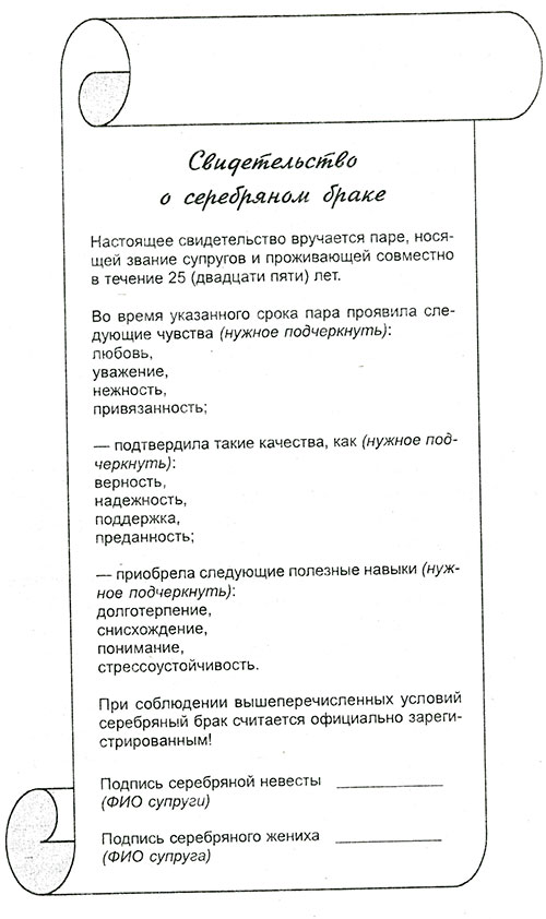 Тамада подає подружжю «свідоцтво про срібному шлюбі». Такий документ можна придбати або ж надрукувати самим, прикрасивши срібною фольгою.