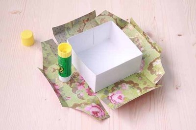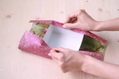 Підійде будь-яка коробка, відповідна за розміром, потрібно тільки її ошатно оформити, наприклад обклеїти красивою папером. Для цього вам знадобиться відповідна папір, двосторонній скотч, ножиці. Обклейте спочатку зовнішню сторону, залишаючи припуски, загорніть припуски і обклейте внутрішню сторону, в останню чергу обклейте дно.