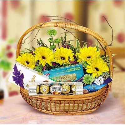 Для упаковки подарунка можна використовувати різноманітні за формою і розміром плетені кошики. Підберіть підходящу за розміром кошик, покладіть в неї подарунок і упакуйте попереднім способом або просто затягніть плівкою, закріплюючи кінці знизу скотчем. В кошик зазвичай поміщають фрукти, цукерки, косметику, квіти, іграшки.