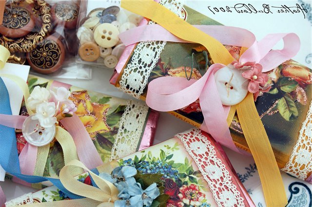 Коробка готова, можна доповнити її стрічкою, квіточками, ґудзиками, тканиною, тасьмою, бантами та ін.