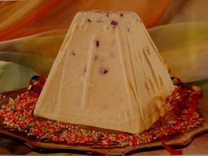 800 г сиру, 450 г вершкового масла, 6 яєчних жовтків, 2 склянки цукру, 300 г густих вершків, цукати, мигдаль, ванілін, лимон, солодощі.