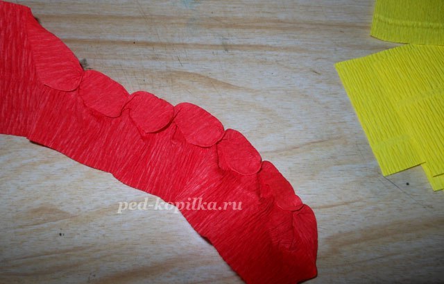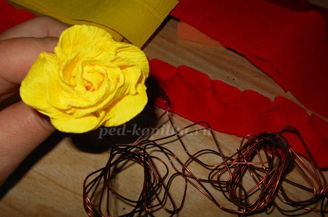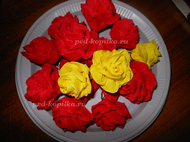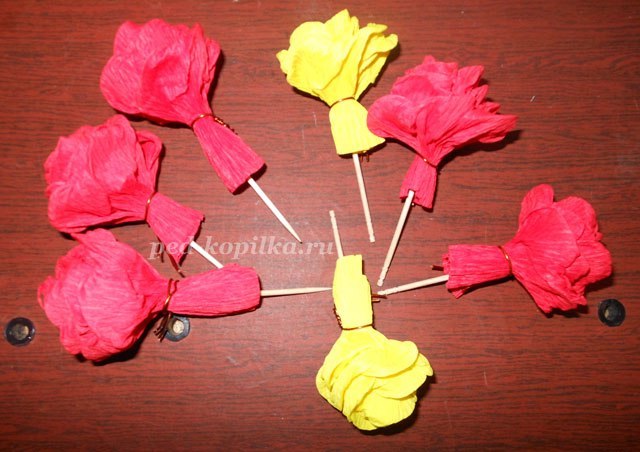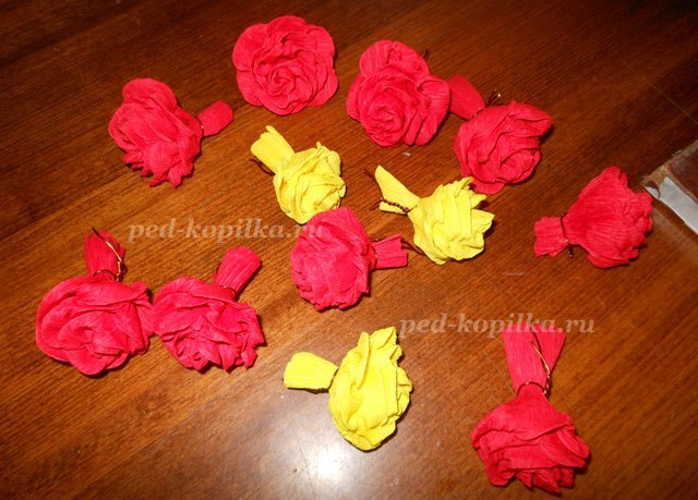 Тепер беремо органзу нарізаємо на квадрати 10х10 і за допомогою довгої шпаги накручуємо квадратик і вставляємо між трояндочками