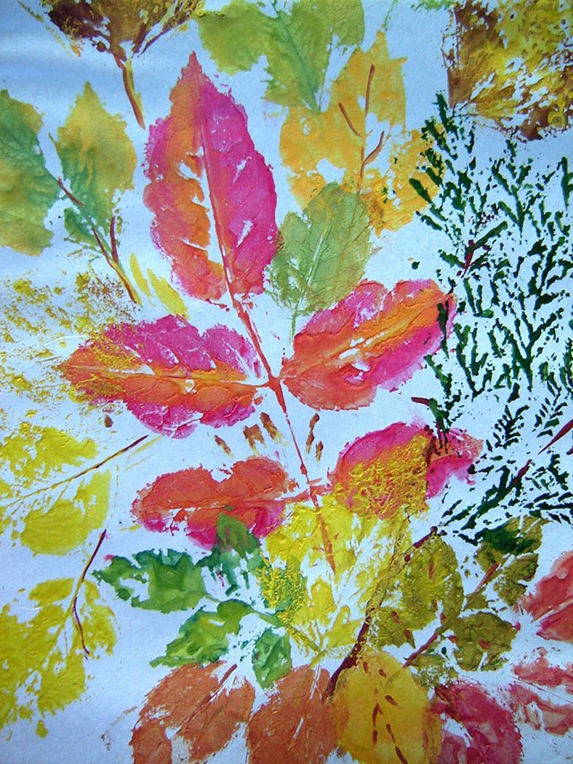 Прийом «відтісування рослин» можна використовувати в осінній період. Спочатку потрібно заготовити листя дерев різної форми і кольору. Наносимо фарбу на лист дерева, перевертаємо, прикладаємо до аркуша паперу і притискаємо. Вийшов відбиток осіннього листа.
